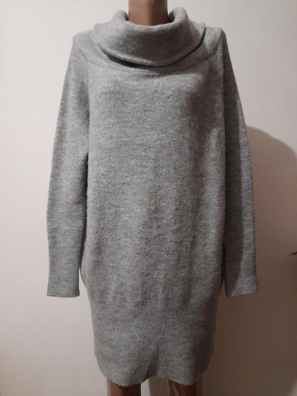 Теплый свитер платье с объемным воротником, светлосерый цвет, плотная толстая пряжа, размер указан 10, можно больше, низ тянется. Состояние отлично. Грудь 59, длина 80, бедра 54, низ 45, плечи 54, рукав 63.