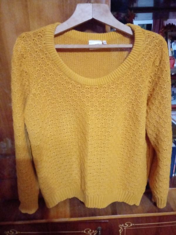 дуже гарний стильний світерок,красива в'язка,яскравий гірчичний колір,тягнеться,мірявся на 56розмір ,дуже гарно,річ якісна не штучна ,що немало важно,при потребі заміри додам