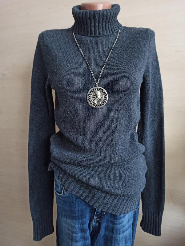 Светр темно-сірого кольору під горло з довгими рукавами,в районі ліктів нашивки від протирання.Пог 40 см ,Пот 35 см ,Побіди 39 см По низу 37 см , довжина рукава від горловини 77 см , довжина светра 67 см .Склад:40%бавовна,25% віскоза,10% ангора,25% поліамід.