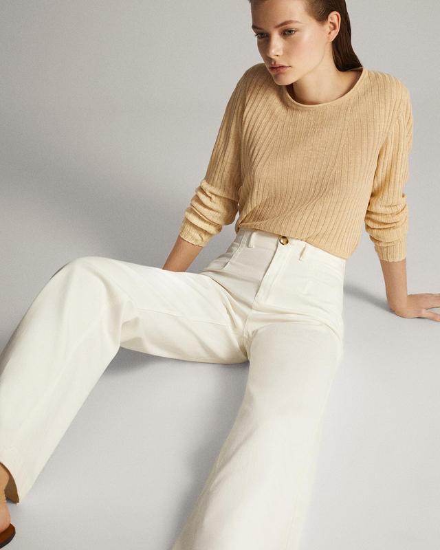 Светрик з 100 % натурального льону . Дуже приємний до тіла і цікаво виглядає . Розміри M, L. Колір ніжно- бежевий.