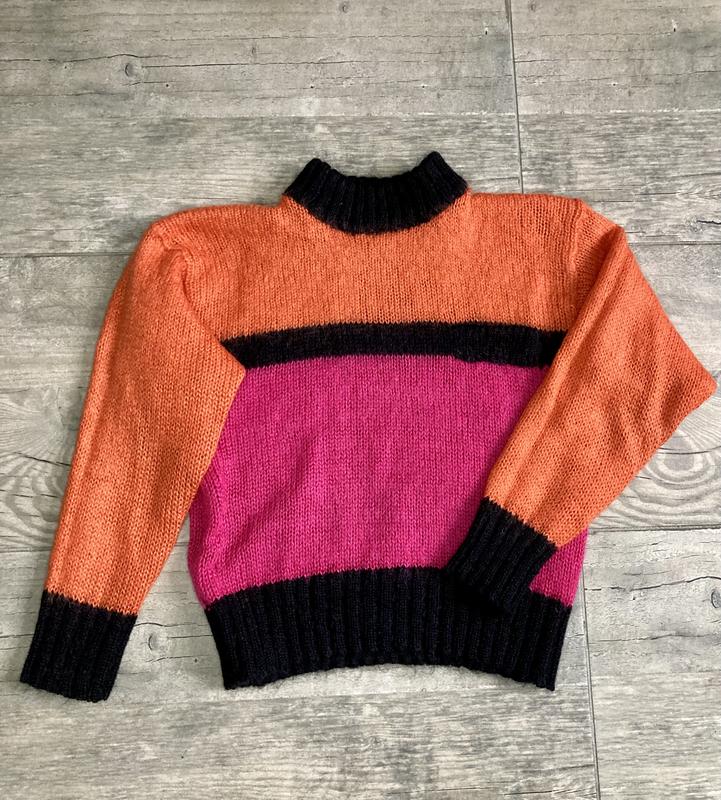 Яркий свитер размера S Состав - мохер, акрил Длина - 50 см Обхват груди - 90 см Длина рукава - 48 см Длина от воротника до рукава - 14