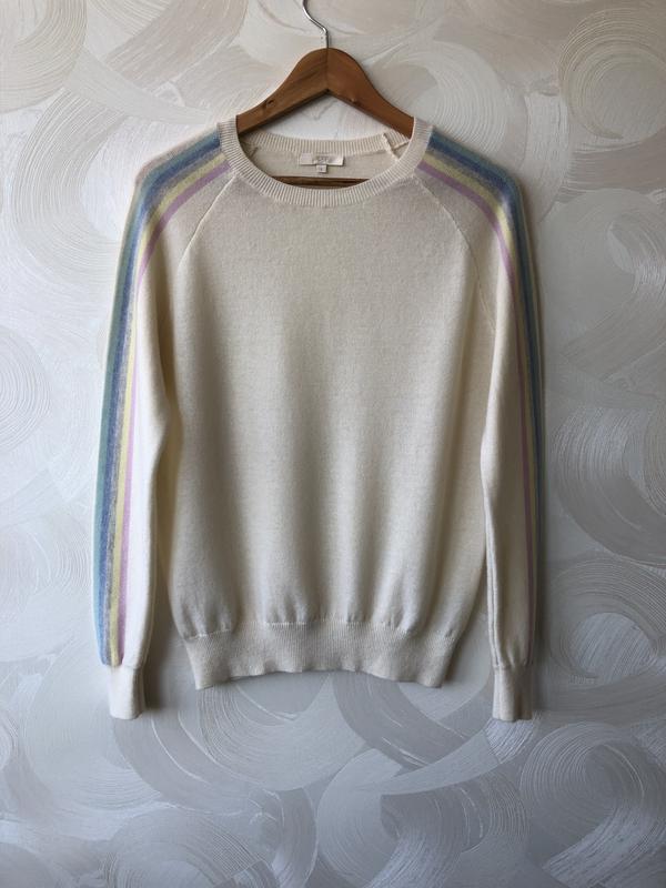 Симпатичный шерстяной свитерок JEFF. Цвет молочный . На рукавах цветные полоски 🌈 . Отличный состав - 90 шерсть 10 кашемир . Состояние идеальное. Размер 1 , на S или М. Длина 61 см Пог 49 см Рукав от горловины 71 см
