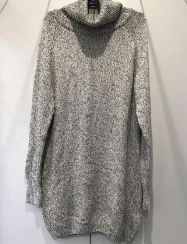 Тепле плаття холодна осінь / зима / весна .Воно ідеальне . Нитка біла + темно-сіра . Щільніша в'язка , не світить . Високий комір. Рукав і вниз на гумці . Без дефектів і нюансів. Розмір вказано Л, але можна як оверсайз . Заміри Довжина 80-82,пог 52см,рукав від горла 74см