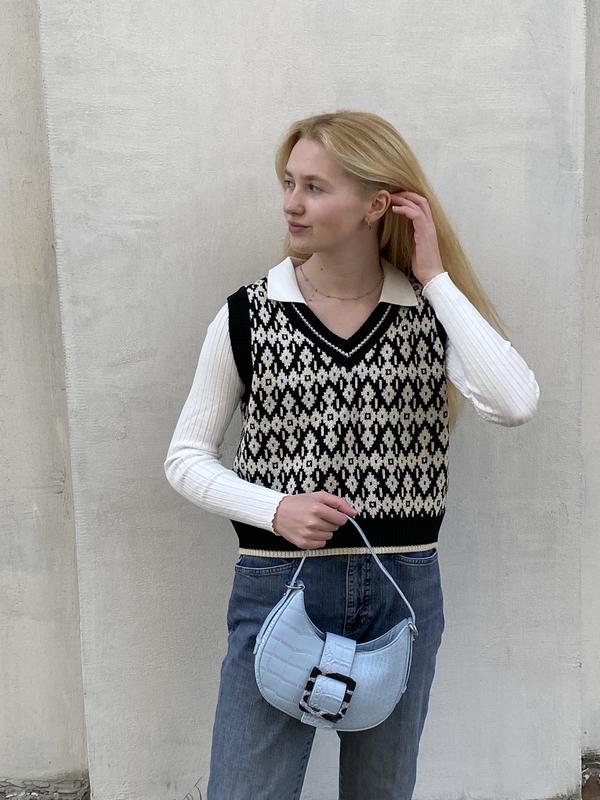 Жилетка|безрукавка з візерунком Розмір: бюст - 96, плечі - 38, довжина - 50 см Матеріал: акрил + поліестер Вишлю додаткові фото при потребі💙