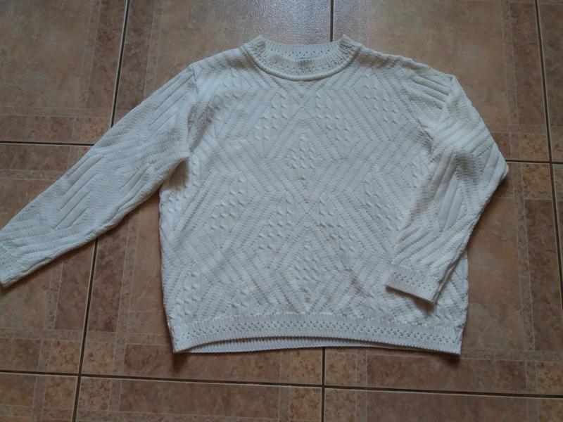 длина свитера 59 см, ШГ - 54 см, длина рукава 55 см. Размер не указан, подойдет на S, M, L