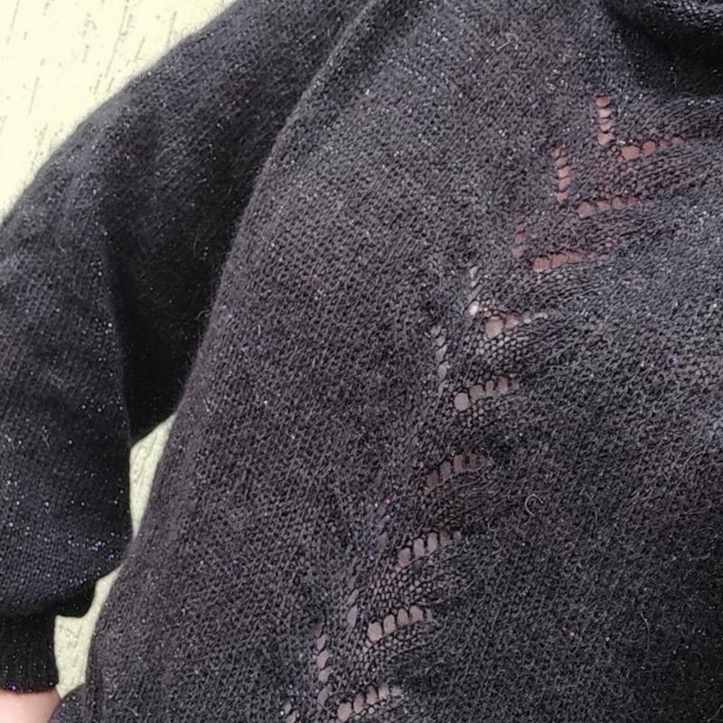 Свитер из итальянской пряжи мохер с добавлением люрекса.Связан на вязальной машине с узором на рукавах и спереди ,ворот хомут.
