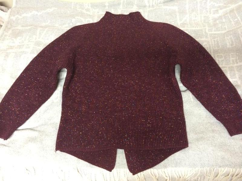 Модель подойдёт как к джинсам так и к юбке, немного "летучая мышь". Модный в этом сезоне цвет, вязка с люрексом. Фото не передаёт истинный блеск. Очень круто и дорого смотрится. Длинна спереди от горловины 60 см, рукав 3/4 от плечевого шва 60 см, от шва подмышки до второго шва 47 см., длинна сзади от горловины до крайней точки "хвостика" 67 см.