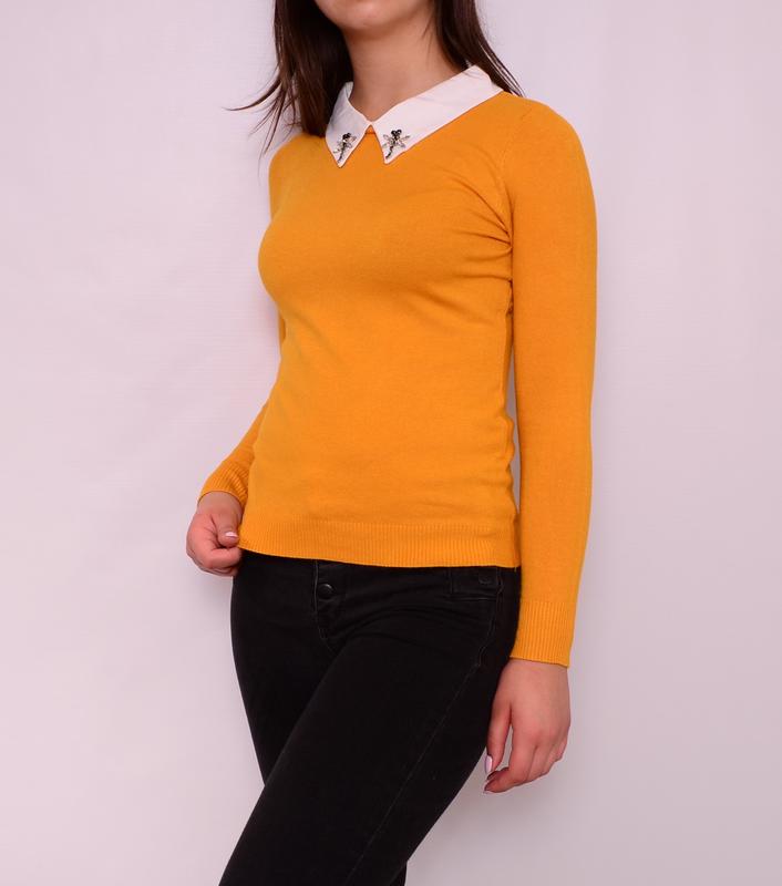 Вязка средней плотности, гладкая. Ткань мягкая и приятная на ощупь. Силуэт приталенный. Свитер с белым воротником. На воротнике декор - стрекоза из камней. Размеры: S/M, L/XL. Состав 40 % вискоза, 25 % модал, 20 % хлопок, 15% эластан. Замеры для S/М ПОГ - 40 см Низ, резинка - 37 см длина - 57 см Рукав - 58 см Замеры для L/XL ПОГ - 41 см Низ, резинка - 38 см длина - 58 см Рукав - 59 см