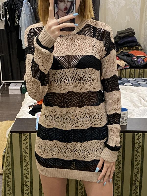 Полупрозрачный удлинённый свитер в размере 10, надет на фото на размер 8. Плечи 52 см Рукав 65 см Длина по спине 72 см