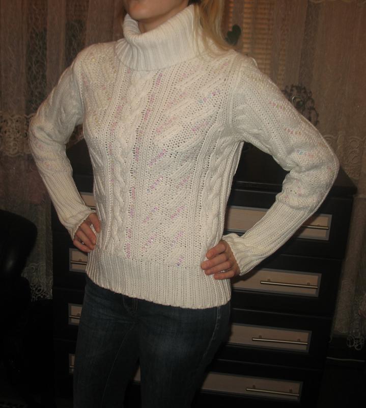 Нарядный белий свитерок украшен паетками.Пойдет на размер XS-S-M. Замеры в нерастянутом виде,неплохо тянется длинна-54 плечи-37 рукав-62 ОГ-88