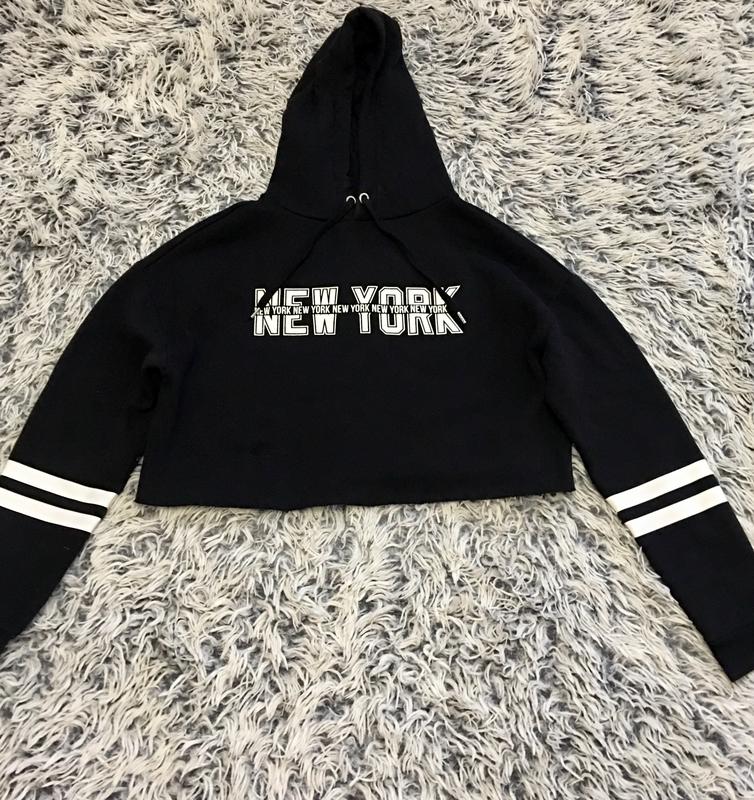 Кофта-світшот укорочена, з капюшоном, всередині утеплена баєчкою, розмір-s вільного крою. В ідеальному стані.