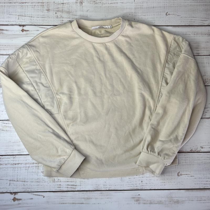 Молочний світшот зі вставками на рукавах. Розмір пише S, йде оверсайз, але краще буде на М.