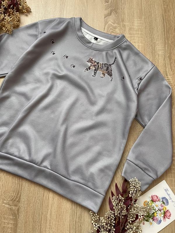 Милий світшот сірого кольору утеплений, зсередини на приємному густому флісі На грудях має зображення котика та котячі лапки🐈🐾 Розмір вказано Л. Також буде гарно виглядати на менший розмір S-M, як світшот вільного крою Стан ідеальний, практично новий Заміри: Плечі 53 Пог 56 Пот 50 Довжина 63 Рукав 50, від шиї 66 Стан: