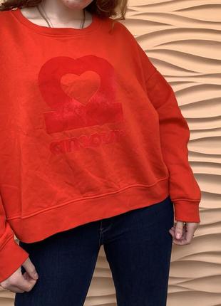 Світшот як новенький, без дефектів, носила мало. Всередині м'який. Матеріал: 82% бавовна, 18% поліестер. Розмір XL. На фото одягнений на 12 UK(48 укр) розмір. Колір морквяно-червоний, по середині велюровый напис amour.