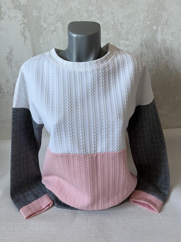 Фактурний світшот🌸стан нової речі(бе паперових ярликів),ньюанс(пляма на зворотньому боці)заміри:пог-52см,низ-45,3см,плечі-66,5см(спущені),довжина рукава-45,6см,довжина по спинці-58см