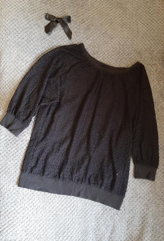 Чорна кофта з перфораціями на резиночці внизу та з резиночками на рукавах. Рукава 3/4. З лицевої сторони на перфорації приємне замшеве напилення. Можна носити вирізом на одне плече. Розмір 16 За додатковими питаннями і замірами звертайтесь у повідомлення.