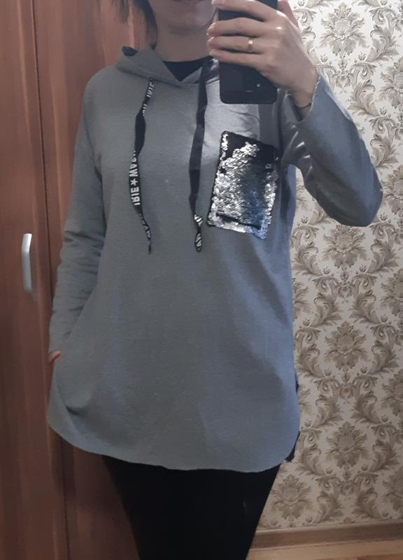 батник в стиле спорт-шик, страна производитель Италия размер oversize карман нагрудный в пайетках длина 77см ширина 51см капюшон средней глубины