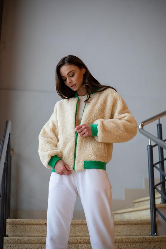 📌Бомбер "BEN" из эко меха овчины зеленый Тепленький бомбер «BEN» из эко меха овчины: - Бомбер имеет два прорезных кармана в области талии; - Обработанный манжетами из рибаны в области талии и низ рукава. 1635764318