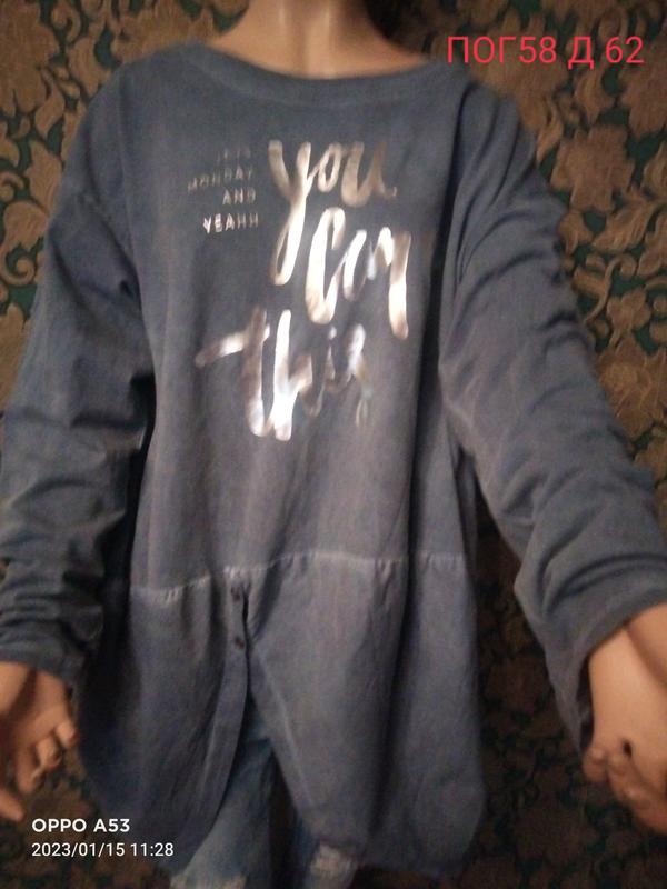 Сірий колір з ефектом потертості,крій бочонок,по низу розрізи на гудзиках,принт сріблом