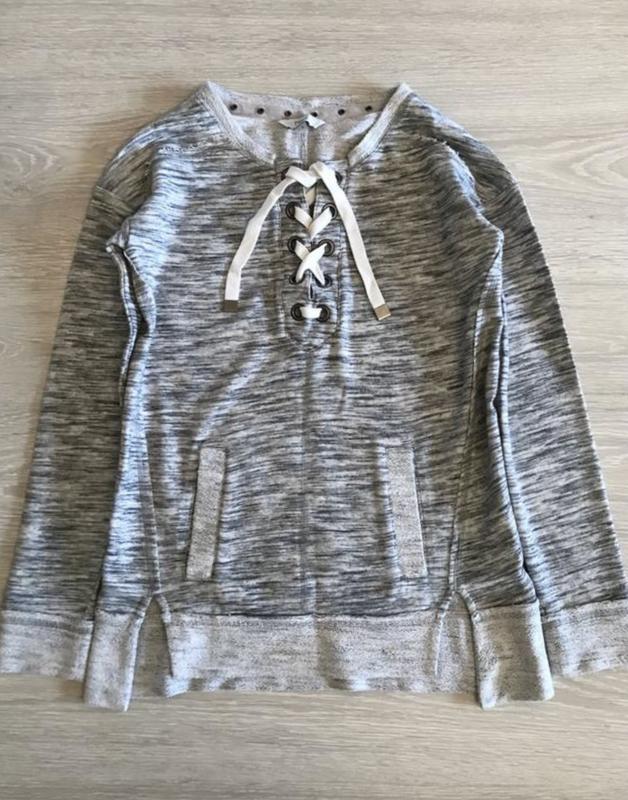 Стильний світшот Next з карманами, на шнуровці в відмінному стані. Розмір 6/34. Довжина 65/68 см. ПОГ 46 см. Рукав від ворота 70 см. Котон 51% Поліестер 49%.