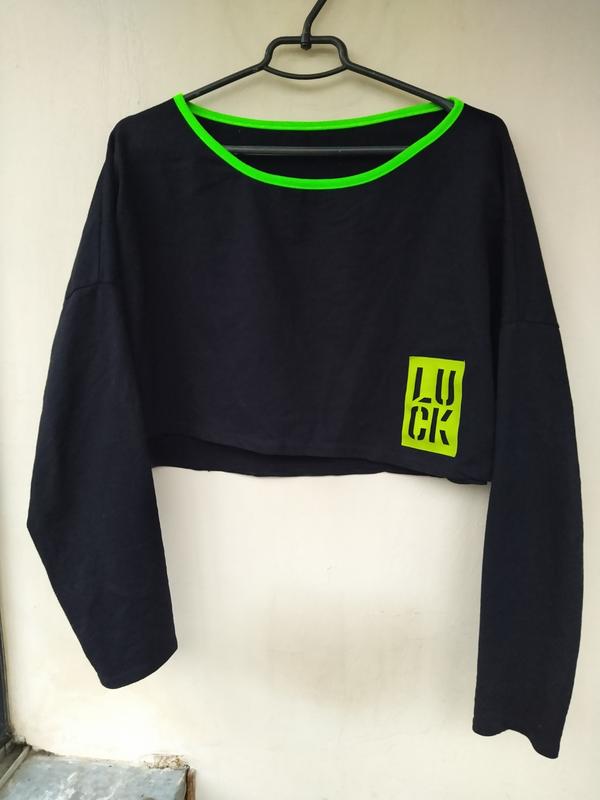 Вкорочений топ. На определенном свете цвета выглядят неоновыми. привкусуем - насыщенно салатовые. Без броков. Надпись на экокоже, очень стильная. Идет оверсайзом, удлиненная линия плеча, будет на L, xl.