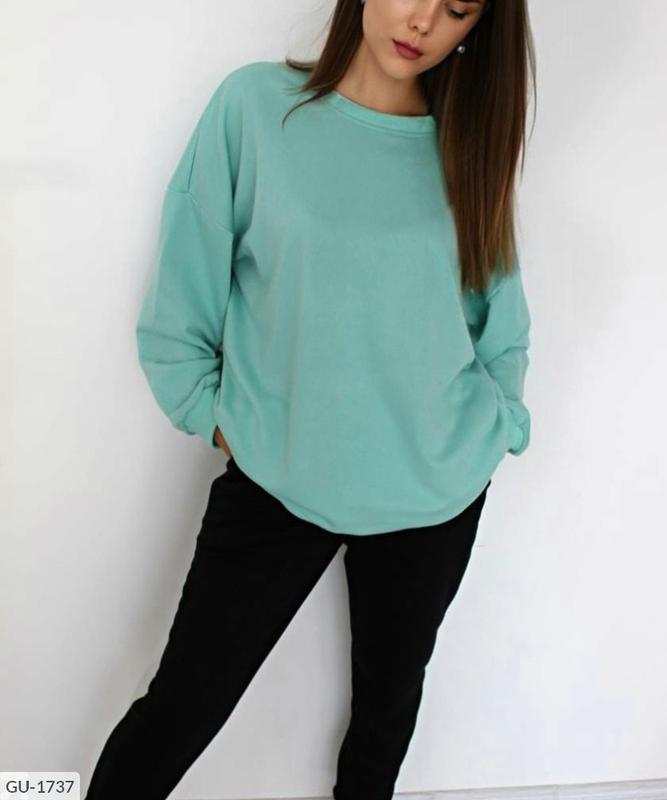 Свитшот GU-1734 Размеры: Универсальный Объем груди 140 см подойдет на любой размер. Длина 75 см, Длина рукава от горловины 74 см. Материал: трехнитка петля + Рибана Цвета: черный, белый, пудра, фреза, горчичный, нежно желтый, бирюзовый, лаванда. (лаванда, черный, мята без рибаны снизу)