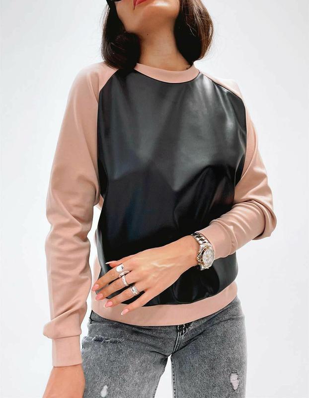Свитшот Модель 223 Ткань: итальянский трикотаж, эко кожа Цвет: черный/беж Размеры: 42-44, 46-48, 50-52 Цена: 520 грн Ищешь идеальный свитшот? Вот он😍 Эко кожа все еще в тренде. Прекрасно будет смотреться с джинсами, лосинами или джогерами из эко кожи. Свободный крой, приятная ткань. Не кашлатится. Немного тянется. Свитшот для любого случая: на работу, учёбу или на свидание😍 Параметры модели: Размер 42-44 Рост 168 см Ог 85 см, от 62 см, об 89 см Замеры: ПОг 50/54/58 Длина рукава от горловины 70 см Длина изделия по спинке 59 см Качество 💣 Фото реал ✔
