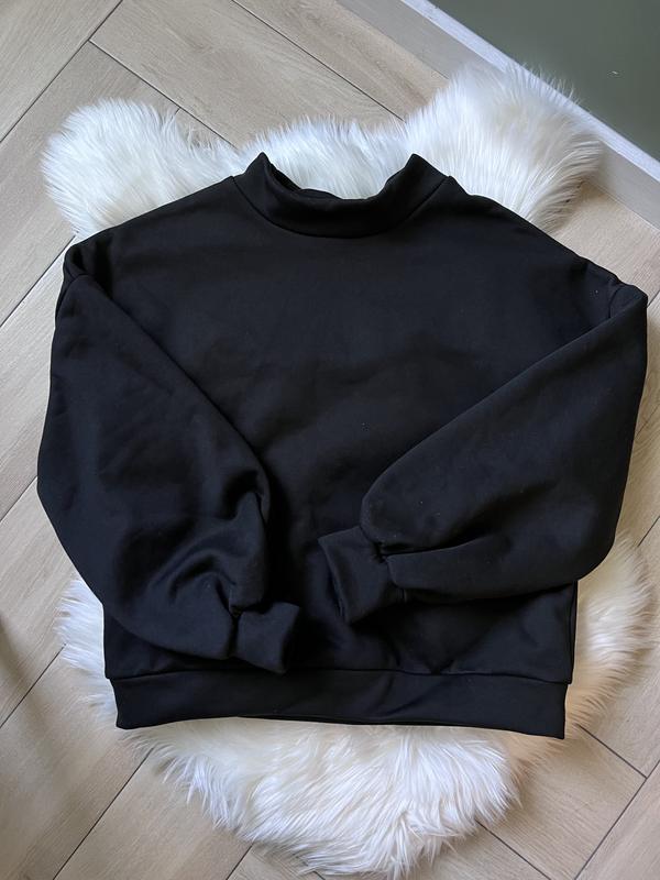 Черный утепленный свитшот в размере Л Новый без бирки Длина 56 Рукав спущенное плечо 48 Ширина в груди 59 Внизу 49 Ткань тянется Рукав объемный