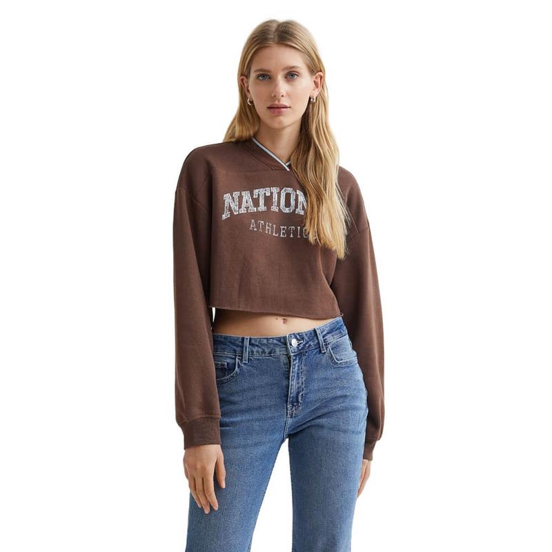 Укороченная толстовка с рисунком спереди и V-образным вырезом. Рубашка имеет заниженную линию плеча, длинные рукава с манжетами в рубчик и отдельный низ с подвернутыми краями. Размер М. Длина 41, в груди 62, рукав от воротника 80. Размер Л. Длина 41, в груди 64, рукав от воротника 80.