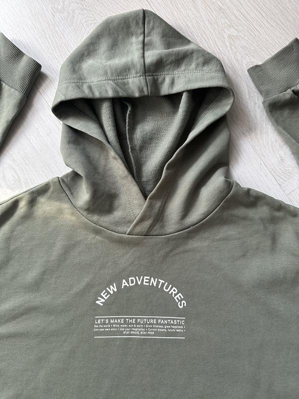 Свитшот бренда H&M оливкового цвета. Купленный в детском отделе, но красиво подойдет на С-М. На рост 155 см подходил хорошо, сидел свободно. По рукаву от капишона 65 см.