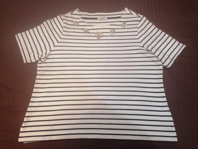 Премиум тельняшка/свитшот в классическую полоску от известного производителя Marks and Spencer. Свитер имеет отделку в виде кристаллов по воротнику, что поднимает вещь на премиум уровень. Премиум состав трикотажа: 60% хлопок (коттон). Тельняшка утепленная (см. на фото), хорошо садится на размер 18-20 UK или 46-48 EU. Тельняшка от суббренда Per Una, который принадлежит компании Marks and Specer. Он отличается смелым дизайном, который ориентирован на молодежную аудиторию. Почувствуй роскошь от простых вещей! Состояние отличное, без дефектов. Размеры: длина переда 67 см обхват грудей 61 см длина рукава 28 см Обратите внимание, вещь рассчитана на рост 175 см. Доставка Укр-почтой или Новой почтой. Предварительная оплата на карточку Монобанка Обмен и возврат вещей не предусмотрен