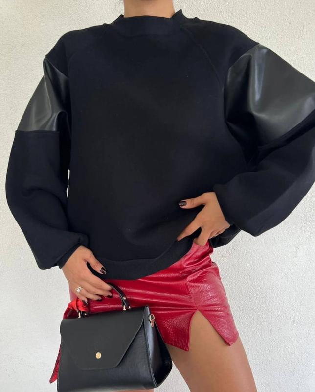 Свитшот с декоративными вставками из экокожи. Размер: 42-46, 48-52 Цвет: черный, белый Тканина: двохнитка люкс Наличие товара 100% #b1026