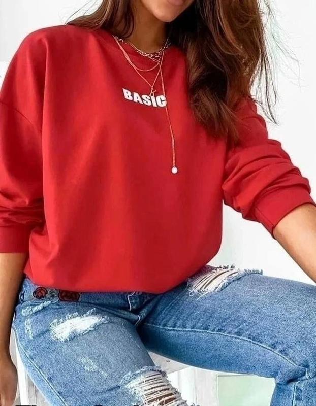 Базовый женский свитшот с принтом BASIC ❤️ Свободный фасон, очень удобный 😍 ✅Модель: 70/1544 Размеры: 42-44, 44-46 Ткань: двунить Цвета: черный/белый/красный/пудра/лаванда ✅Цена: 450 грн