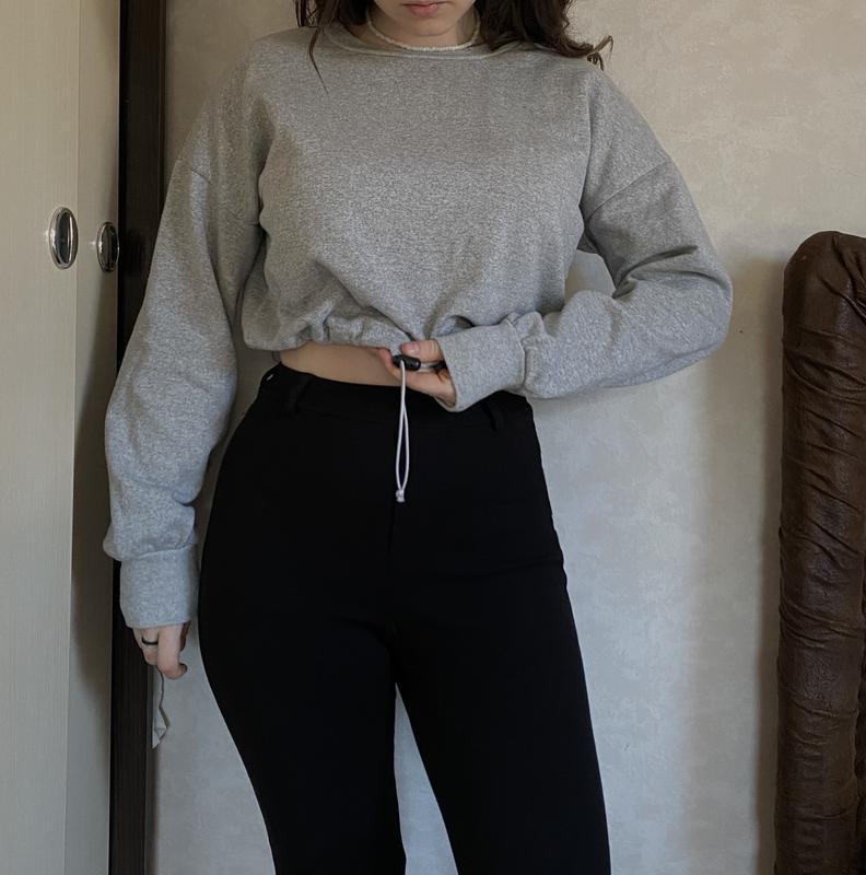 Сірий укорочений світшот, має стяжки, щоб регулювати висоту, приємний до тіла