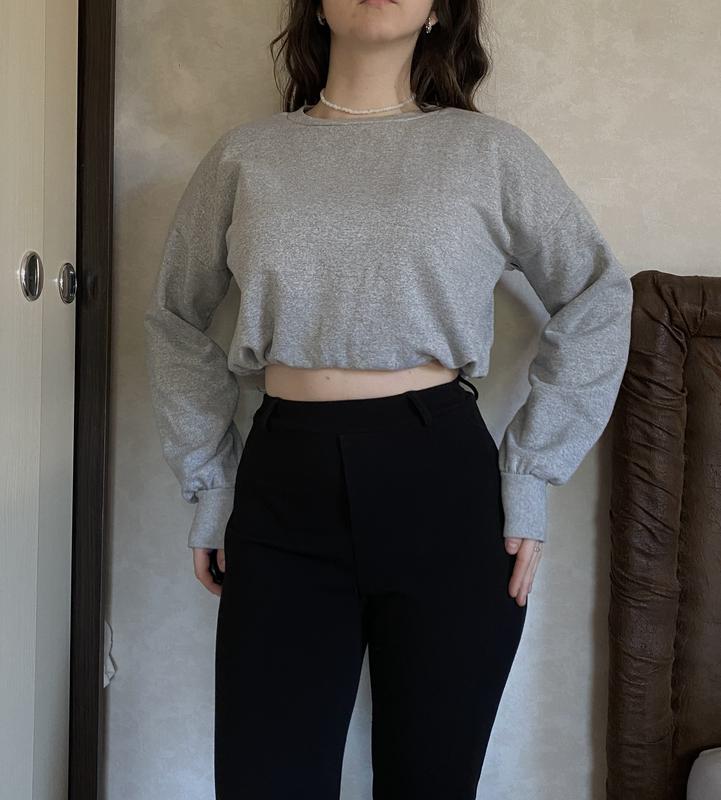 Сірий укорочений світшот, має стяжки, щоб регулювати висоту, приємний до тіла