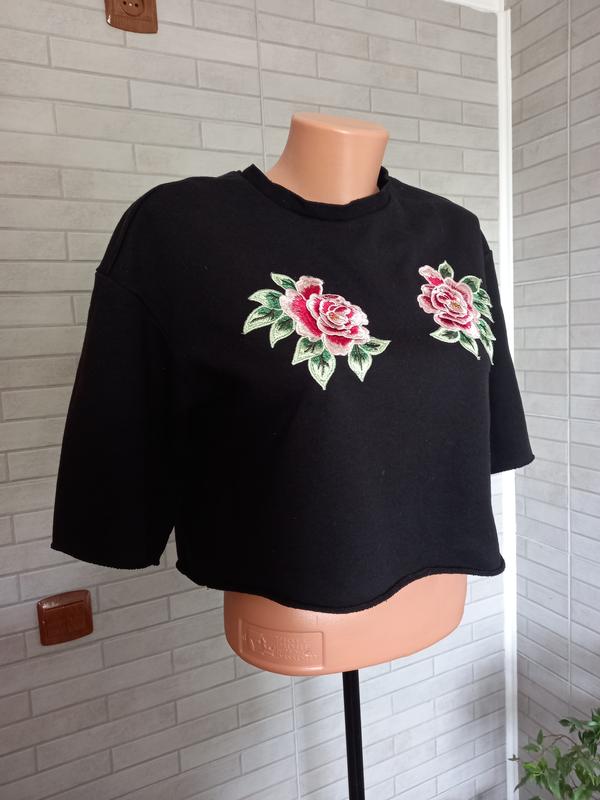 классная кофта-футболка.с объемами цветами размер xs но подойдет на м довж.44 гр.51 см рукав 3/4 от шеи 45 см
