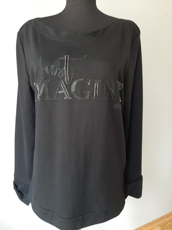 Свитшот бренда Эsprit насыщенного черного цвета в качестве первого фото. Спереди надпись украшена бисером. Размер М-Л. Замеры: от проймы до проймы-54,5 см, крой ровный, по бокам разрезы, длина рукава-65 см, на манжетах разрезы, длина по спине-63 см. Состав ткани: 60% хлопок, 40% полиэстер.