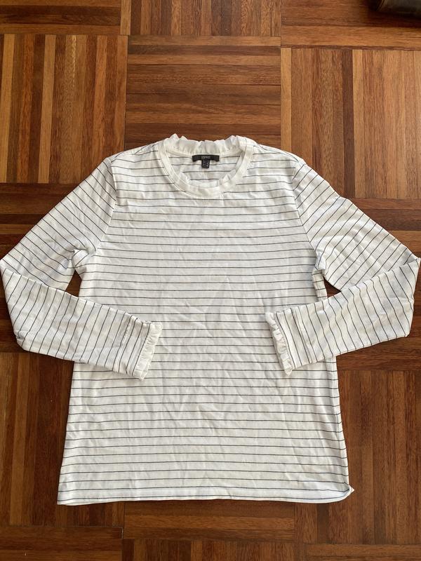 Новый очень классный, в темную полоску и с воланами по горловине и рукавам.