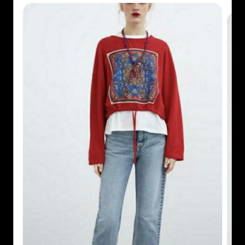 Свитшот от Zara, укороченный на завязках, яркий принт, широкий рукав. Размер L, подойдет и на XL.