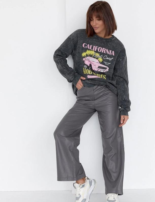 ЗАМІРИ ВИРОБУ Длина переда изделия S – 65см; M - 67см; L - 69см Ширина под прорезями рукавов (над грудью) S – 56см; M - 58см; L - 60см Длина рукава от горловины S – 80см; M - 81см; L - 82см Длина рукава по внутреннему шву S – 50см; M - 51см; L - 52см Параметры модели 84*60*92 роста 173 Размер на фото S Этот молодежный свитшот из трикотажа с начесом покорит твое сердце удобным фасоном oversize, модной расцветкой в технике тай-дай и трендовым рисунком с розовой машинкой и надписью California. У модели прямой низ и длинные рукава заканчиваются трикотажными манжетами. Круглая горловина обшита окантовкой, линия плеча опущена.