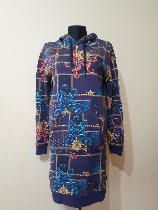 Спортивне плаття Carlo Colucci з капюшоном і практичною кишенею-кенгуру. Виготовлений у модному суцільному принті. Довжина по спинці 86 см, від пахви до пахви 52 см, від плеча до плеча 48 см, від плеча до рукава 59 см.