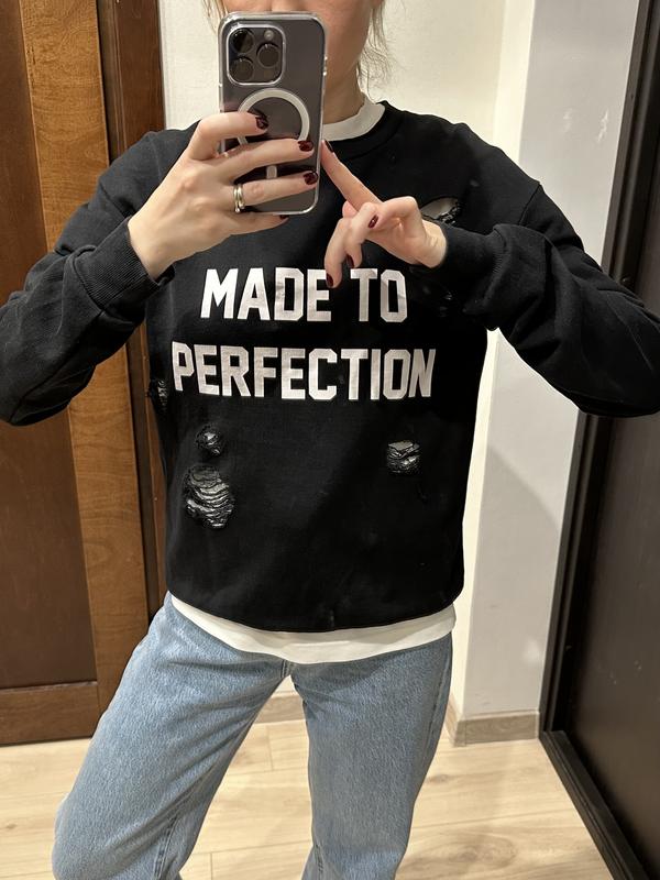 Стильный, рваный свитшот с надписью. Тканина - бавовна. Есть дефект, указанный на последнем фото, поэтому такая цена.