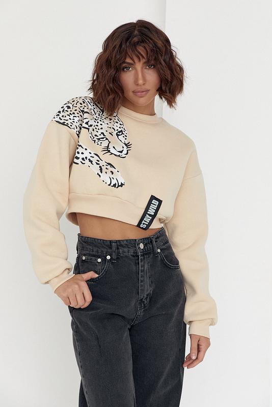 Укороченный свитшот с оригинальным принтом с удлиненной линией плеча, а прямой низ и длинные рукава заканчиваются трикотажными манжетами. Круглая горловина дополнена бейкой в тон. Спереди от плечевого шва расположен принт в виде леопарда. Размер: S, M, L Параметры модели: 84*60*92 рост 173, размер на фото: S; Замеры: размер: S: ДВ - 42 см, ДР от горловины - 74 см, ДР по внутреннему шву - 48 см, полуобхват груди - 50 см; размер: М: ДВ - 42 см, ДР от горловины - 75 см, ДР по внутреннему шву - 49 см, полуобхват груди - 52 см; размер: L: ДВ - 42 см, ДР от горловины - 76 см, ДР по внутреннему шву - 50 см, полуобхват груди - 54 см; Материал: трикотаж 3-нить с начесом Состав ткани: 65% хлопок, 35% полиэстер Страна производитель: Турция.