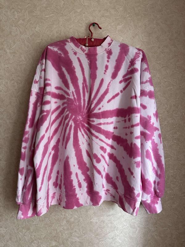 красивый свитшот в модной расцветке тай дай,бирки удалены,хлопок,оверсайз,ориентировочно на размер XL-3XL,пог 72см,пос 60см,довжина рукава від горловини 82см,довжина 67см