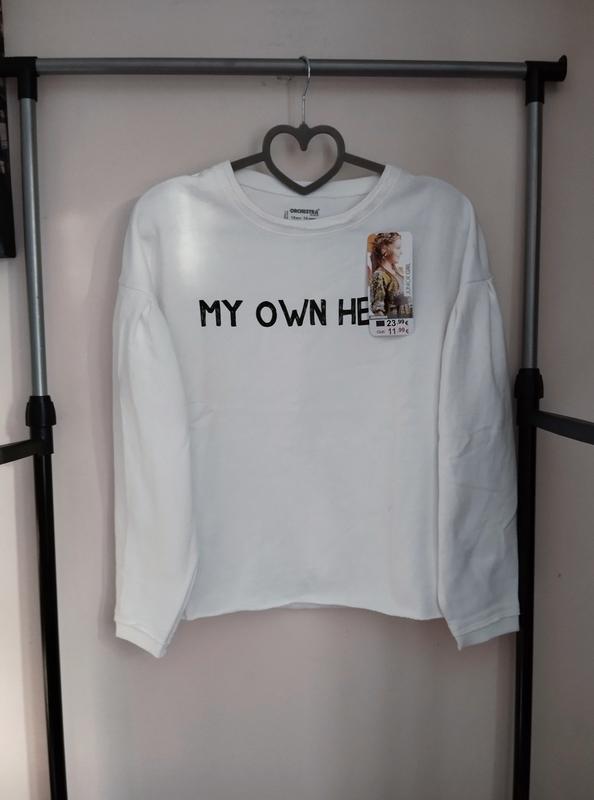 Белый свитшот с стильной надписью по бирочке указан, что он подростковый на рост 164 см но можно и на размер XS-S. Ткань двунитка-петля.