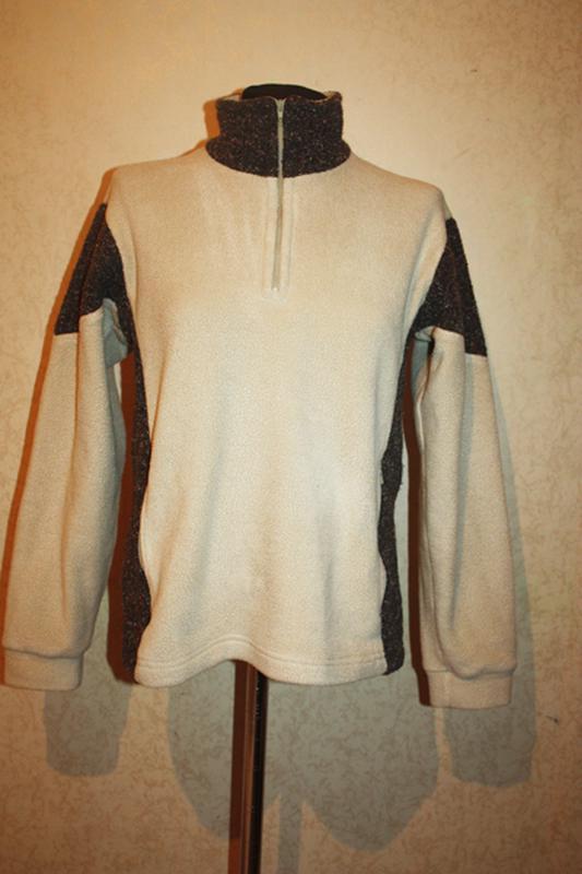 Кофта из флиса с трикотажными вставками, р.S,светло-бежевая, материал - флис-полартек, 100% полиэстер, два кармана на "молнии", длина плеча 14 см, длина рукава 57 см, длина кофты по спинке 58 см, в хорошем состоянии. Состав: флис + шерстяной трикотаж