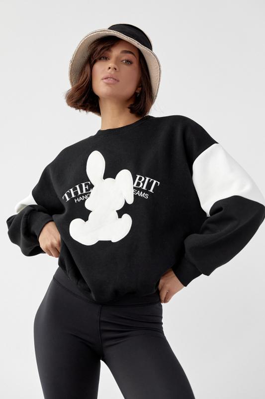 Теплый молодежный свитшот oversize, сшитый из трикотажа с начесом, подарит тебе множество стильных и уютных дней в новом сезоне. Это отличное дополнение и к любимым джинсам, и к женским утепленным джоггерам. В модели проймы опущенные, прямой низ и длинные рукава заканчиваются манжетами в тон, а круглая горловина обшита окантовкой. Спереди свитшот украшен вышитой надписью и аппликацией в виде кролика с машинной вышивкой гладью по контуру.