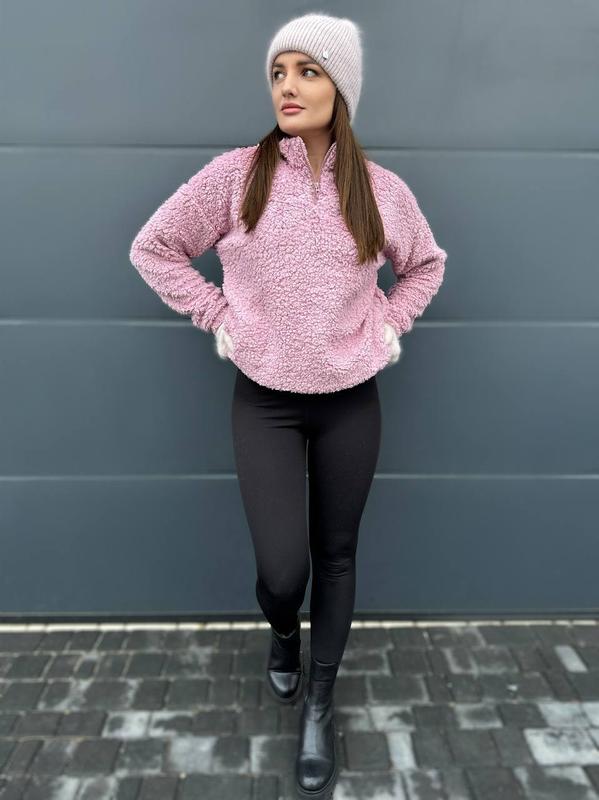 Свитшот Ткань мех «Тедди» на трикотажной основе Цвет графит, молочный, бежевый (таш), пудра Размер 42-44,46-48 Свитшот свободного кроя, горловина на молнии, рукава на резинке, внизу кофта затягивается резинкой с фиксатором Кофты: 559 грн