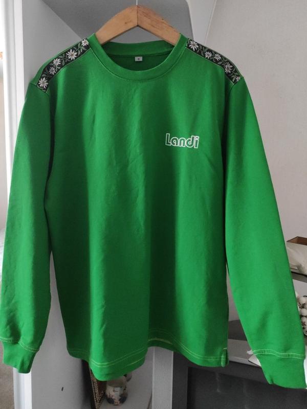 Світшот насиченого зеленого кольору.Колір весняної трави.Прямий крій,є маленькі розрізики по-боках..Щільний,приємний на дотик.Пог-57.Поб-57.Довжина-71.Довжина рукава від шиї-79.Стан нової речі.