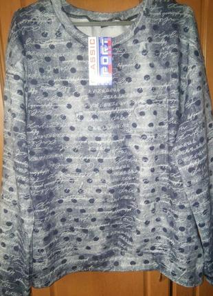 Колір джинсовий блакитний-не передається реально гарний На тканині всі потертості і "растрепки"ефект 3Д-сама тканина гладка Тканину=бавовняний трикотаж з начосом-приємна м'яка тягнеться формодержащая,добре тягнеться Плечі спущені і манжети тягнуться-добре на всі розміри Довжина рукава від горловини 71-см Довжина 68 см ПОГ 62-65cm++++++++ ПОБедра 64-66см